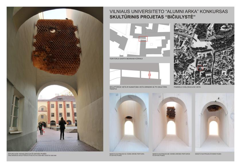 2011. Bronza (Korys, bitės), stiklas (bičių sparnai), grindinyje įleista granitinė lenta su „Alumni“ draugijos simbolika, tekstas. Kūrinio išmatavimai 3000X5000 (H)