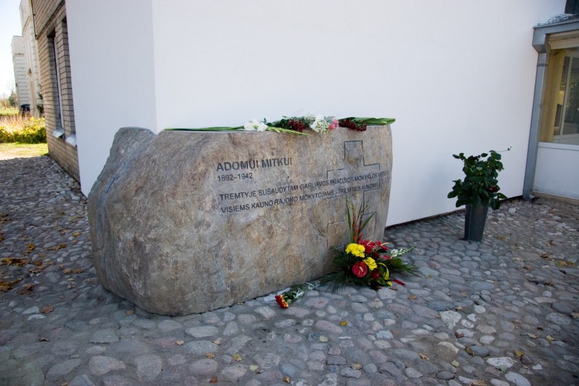 Skulptūrinis akcentas tremtyje sušaudytam Garliavos pradžios mokyklos vedėjui Adomui Mitkui atminti.